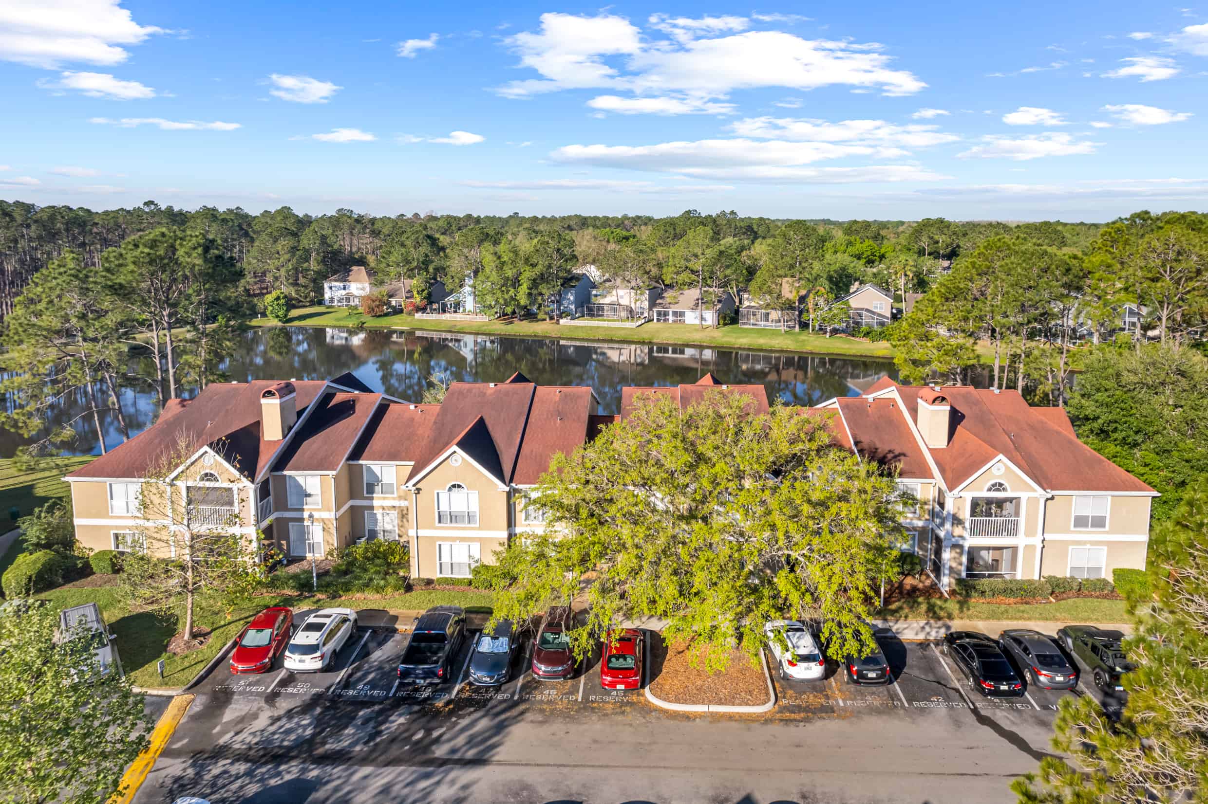 Aerial view of Tampa apartment complex featuring ponds, landscaped grounds, and parking.