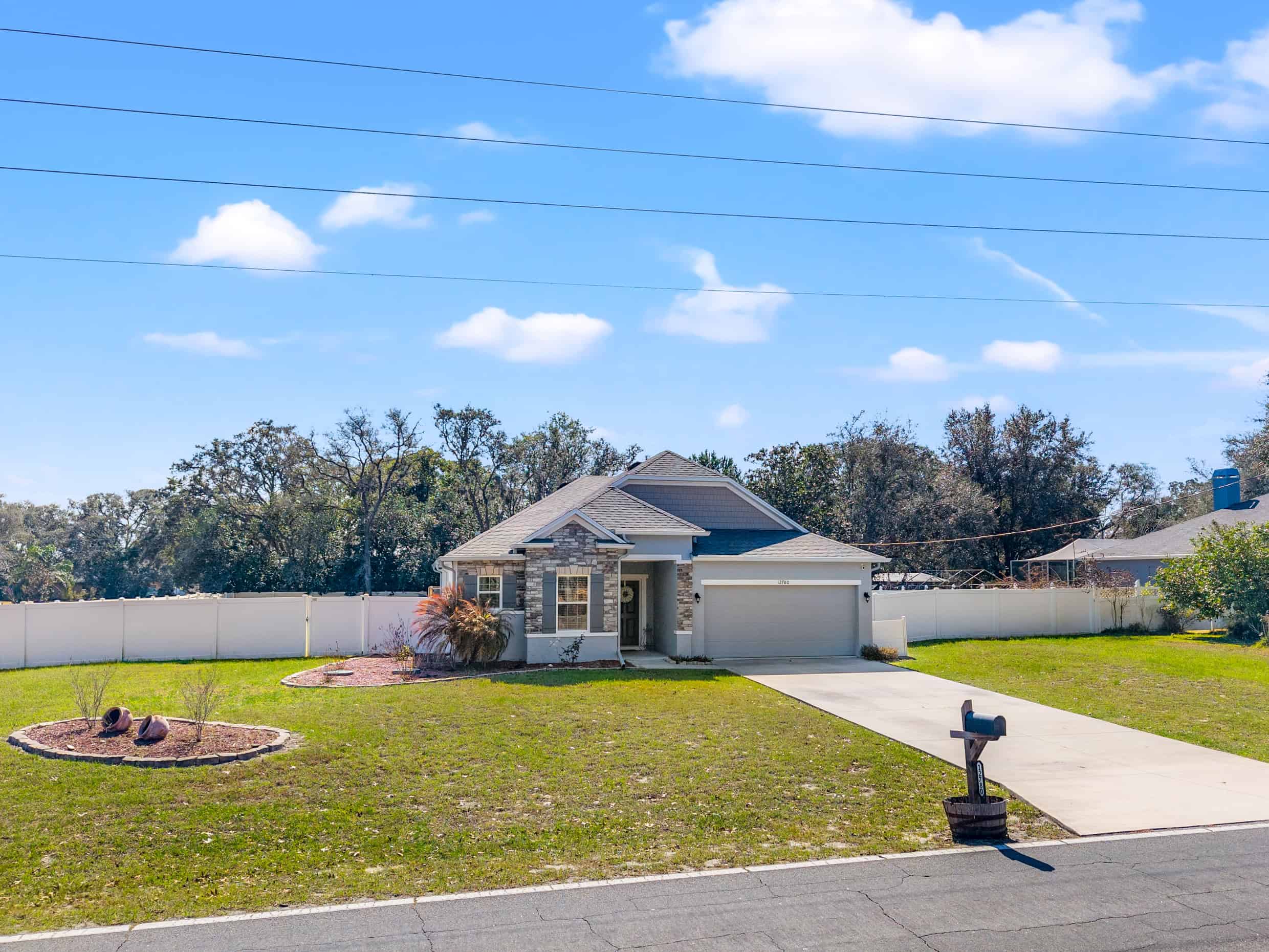 A charming Tampa home featuring a front yard, decorative plants, and a concrete driveway under a bright blue sky.