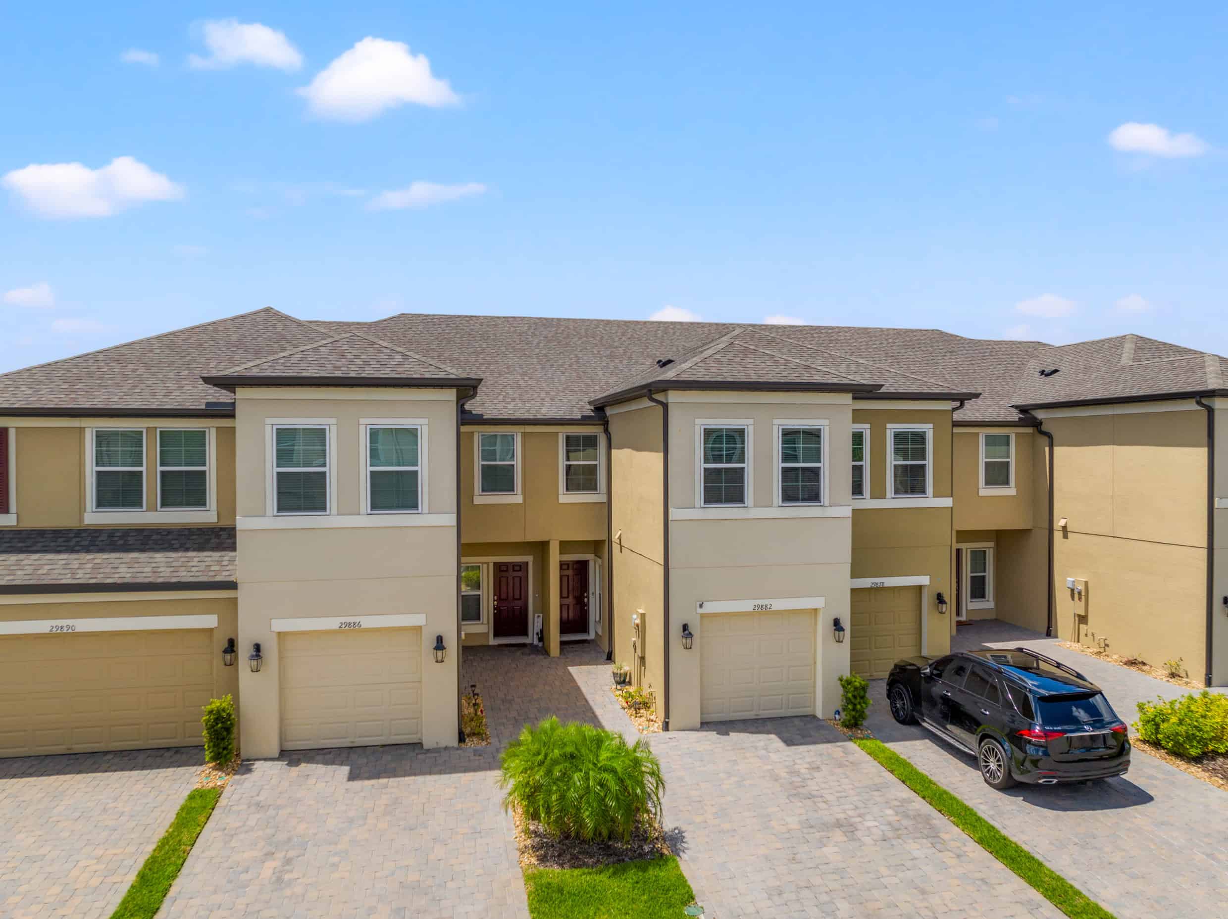 Modern townhouses with attached garages in Tampa, Florida, showcasing vibrant neighborhoods and contemporary housing options.